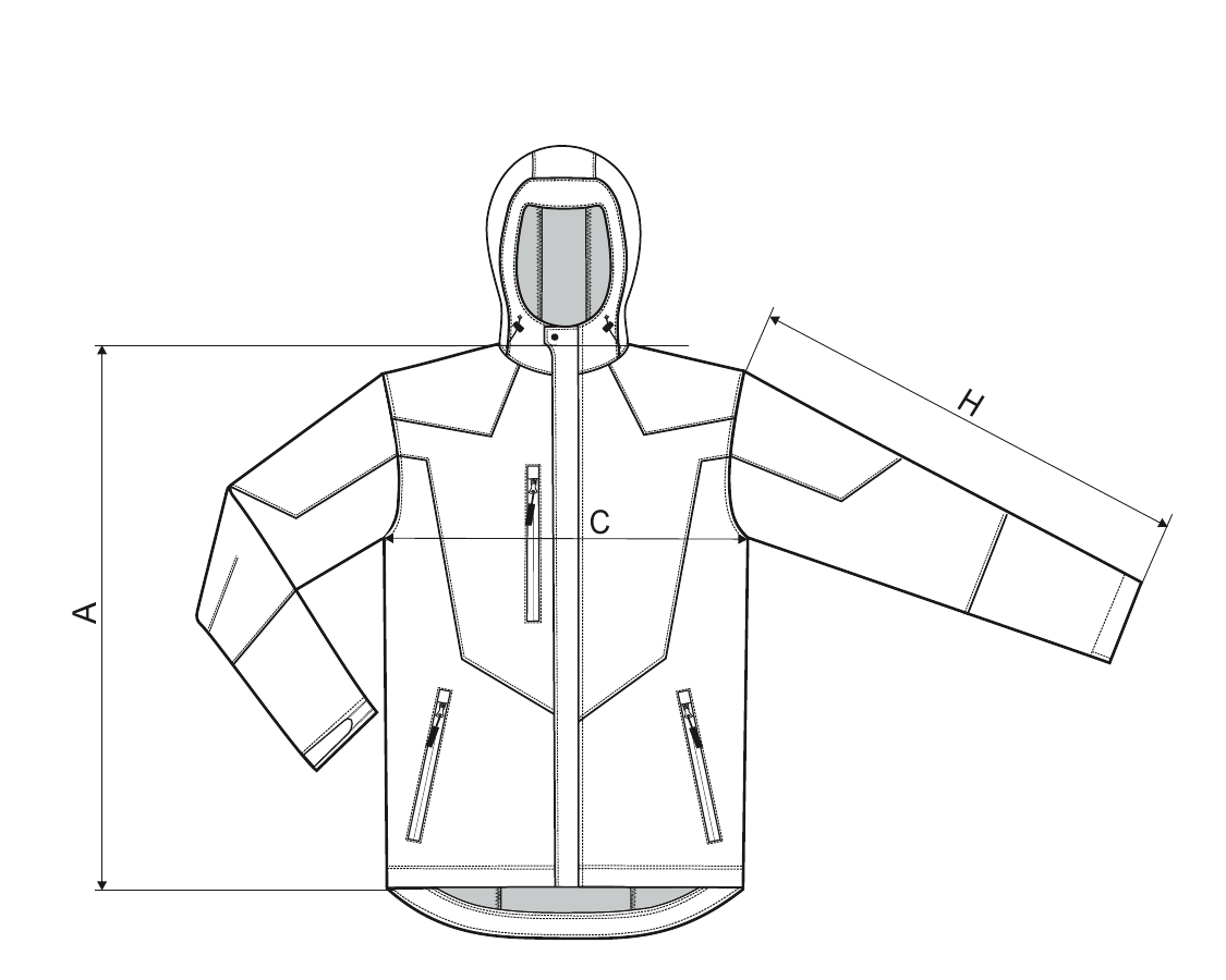 3-régetű softshell membránnal, különleges softshell anyag, Nanotex® felületi kezelés, ami megakadályozza a víz beszivárgását, teljes hosszúságú cipzár hajtókával, kapucni húzózsinórral, állítható kapucni és ujjvégek tépőzárral, zsebek fordított cipzárral, mellzsebek, ívelt, hátul kissé hosszított alj, kontraszt elemek, Használati útmutató softshell anyaghoz