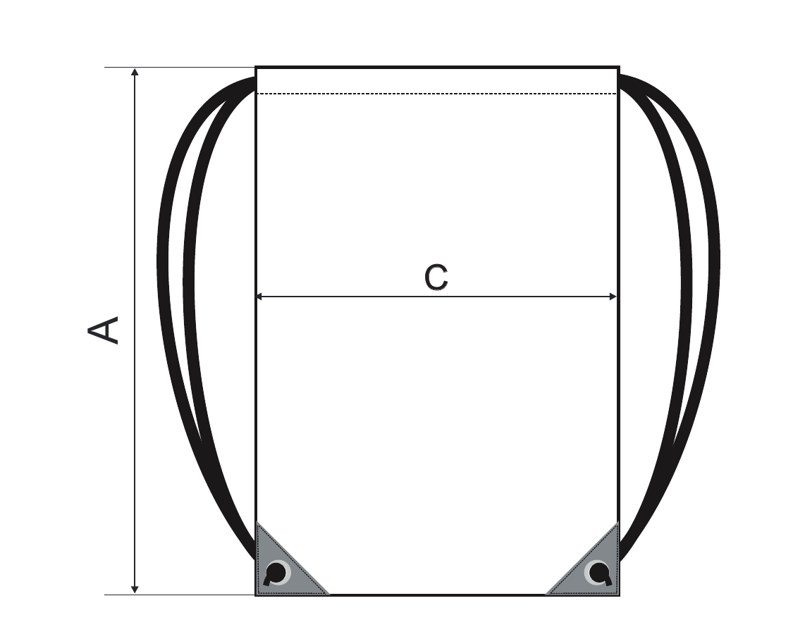 húzózsinórral zárható, 2 polészter húzózsinór 01 színben, fényvisszaverő elemek az alsó sarkakon, belső cipzáros zseb 20 x 23 cm, tornazsák mérete 45 x 34 cm